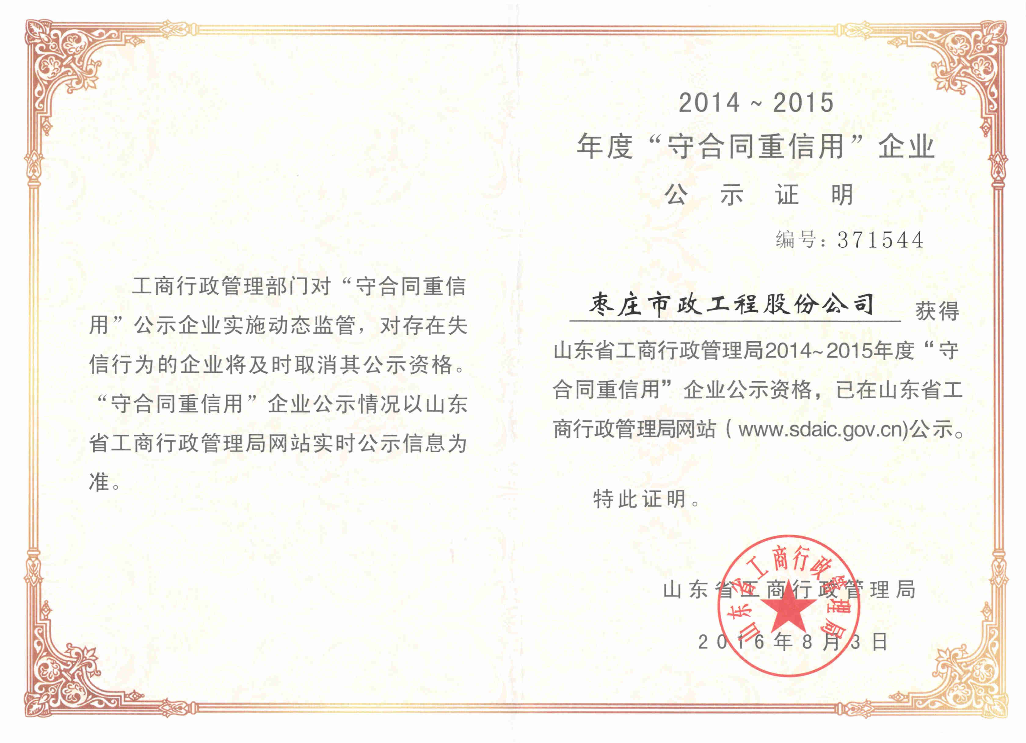 8月31日,我公司從棗莊市工商局領取了2016年省級“守合同、重信用企業”證書,這是公司自2010年成功晉級省級“守重企業”以來第6次獲此殊榮。