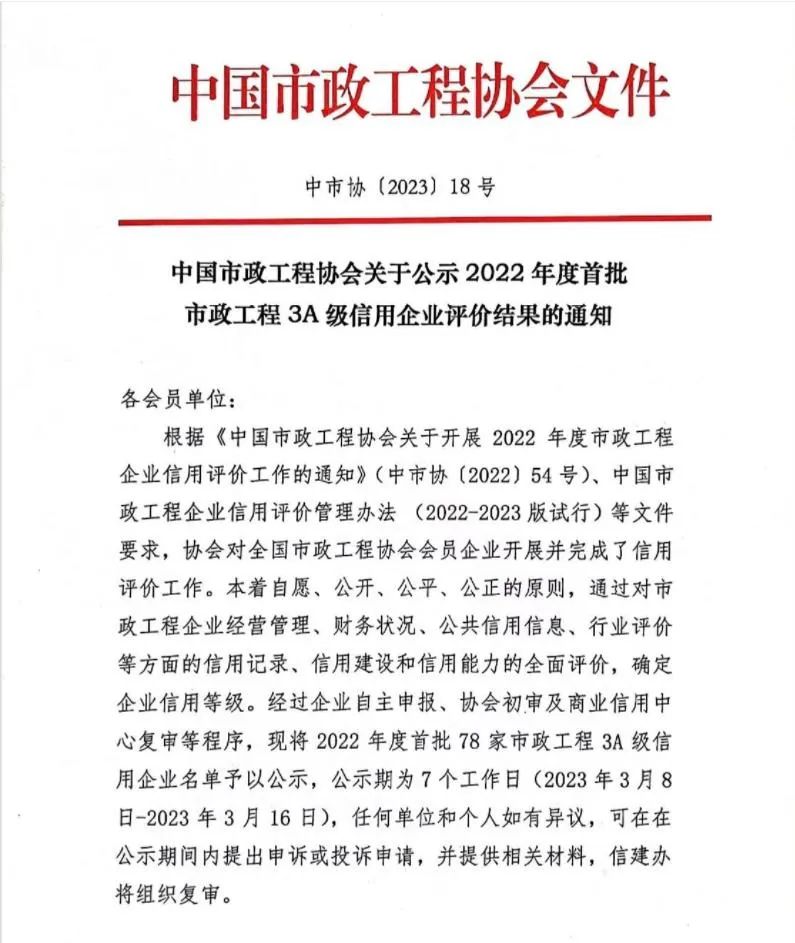 集團公司喜獲“2022年度市政工程3A級信用企業”